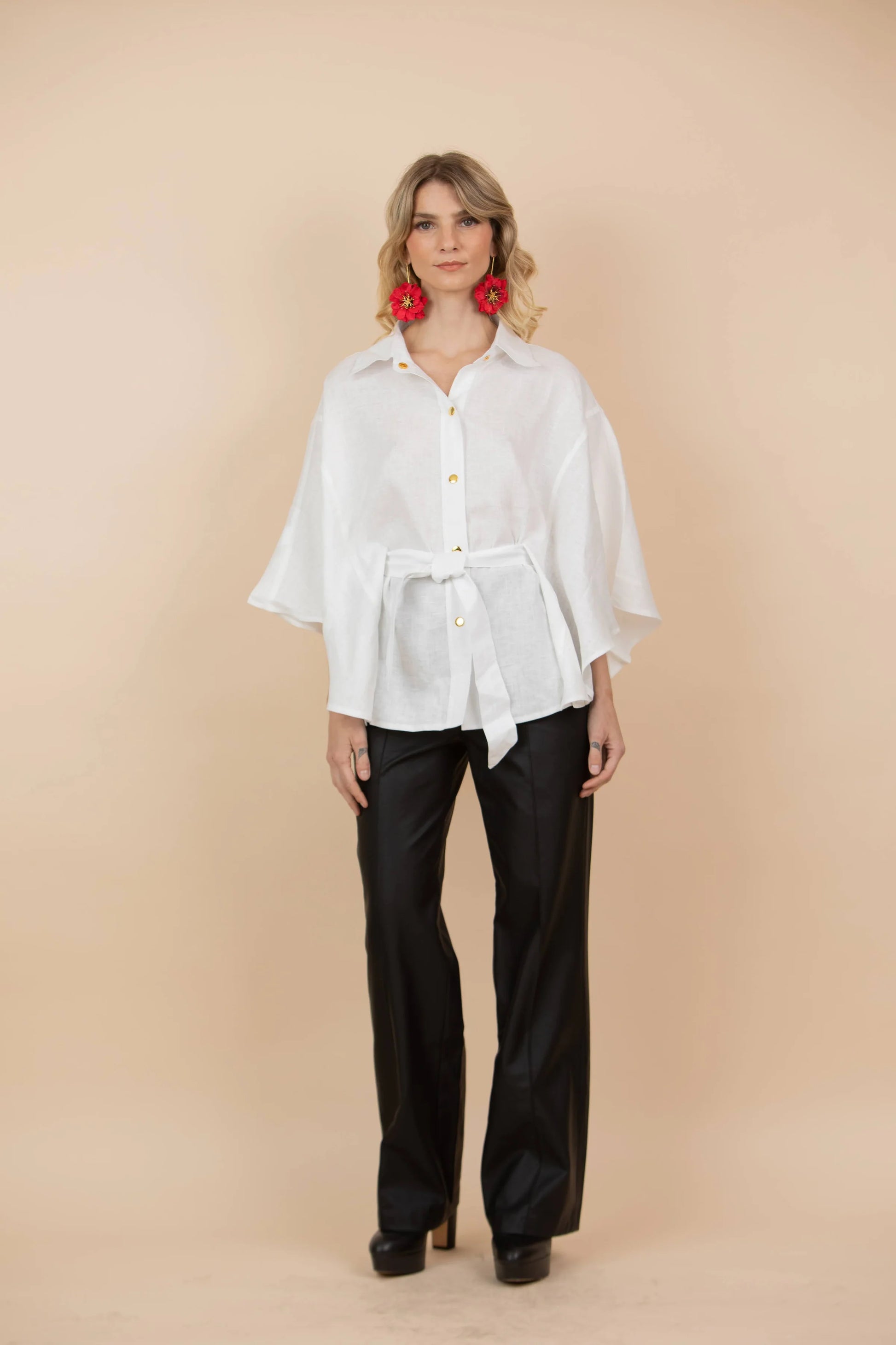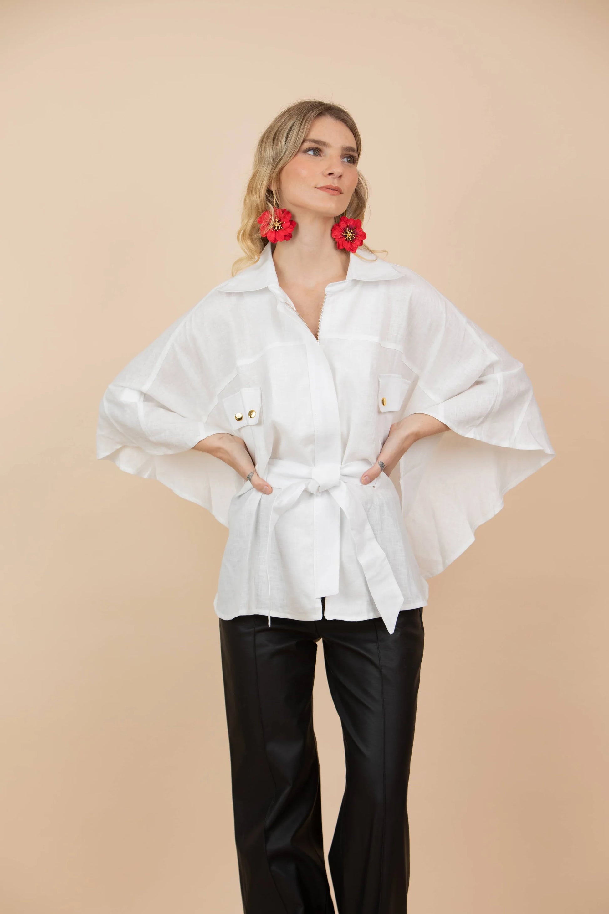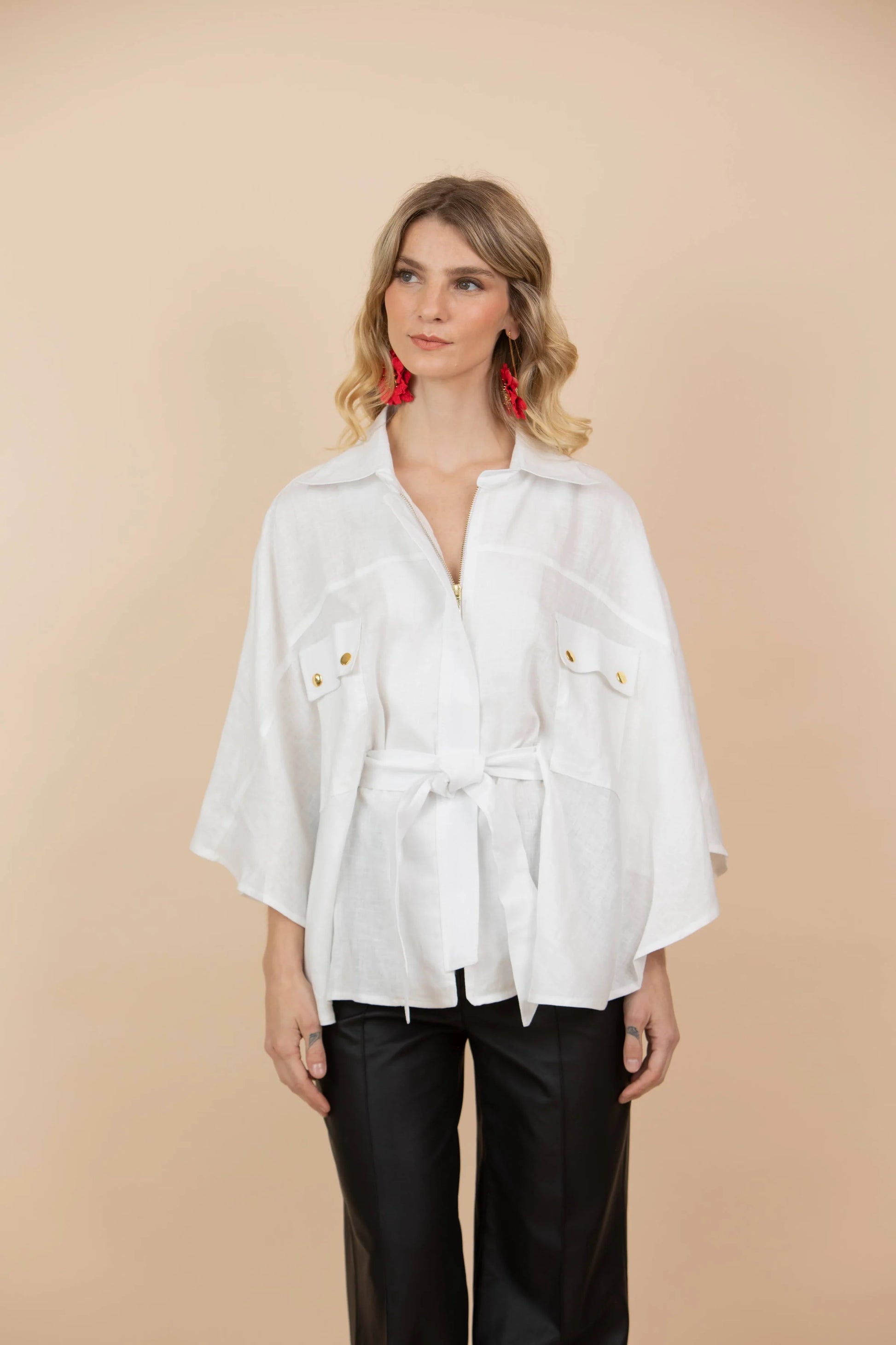 Capa con botones dorados y cinturón.