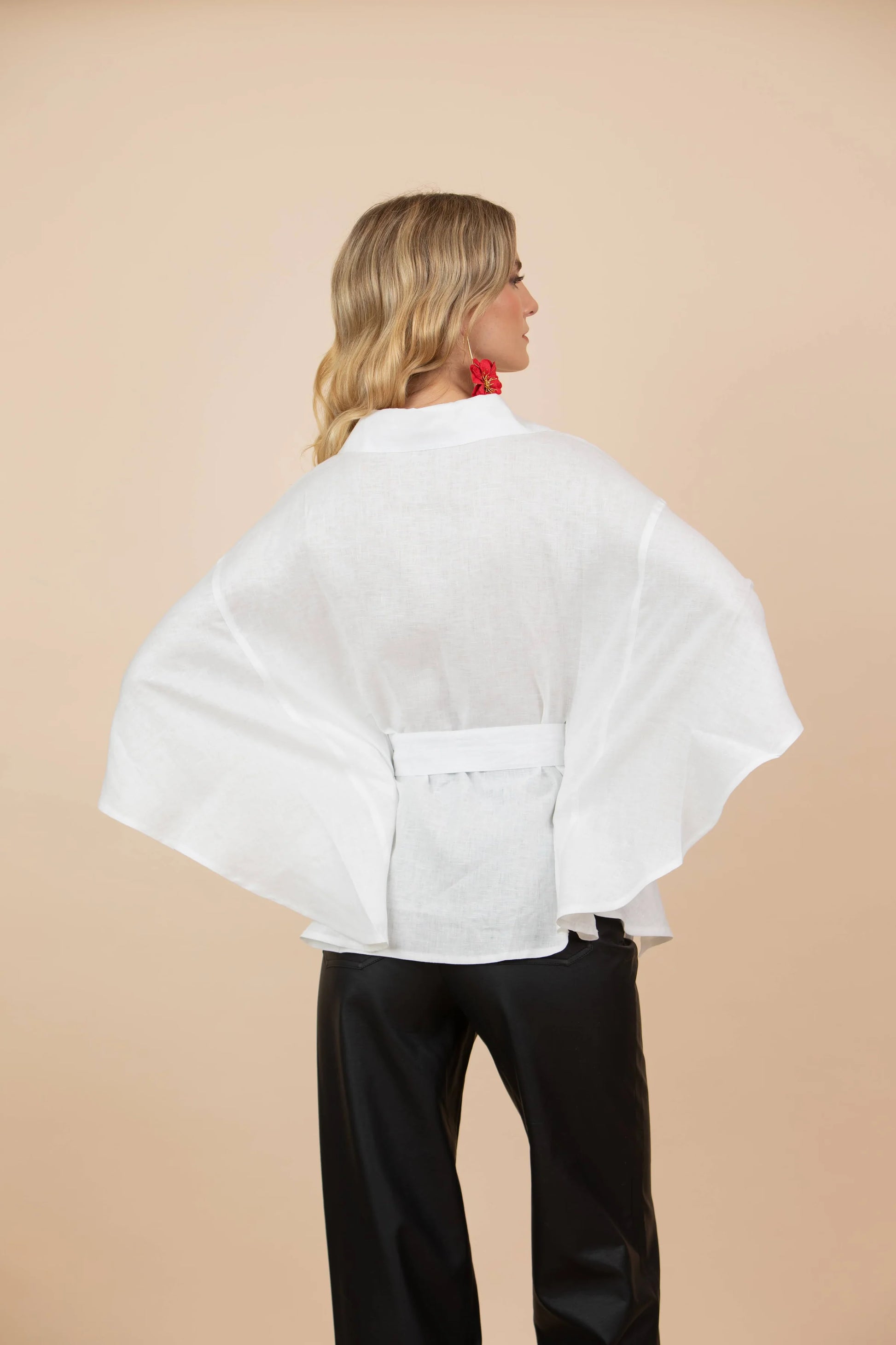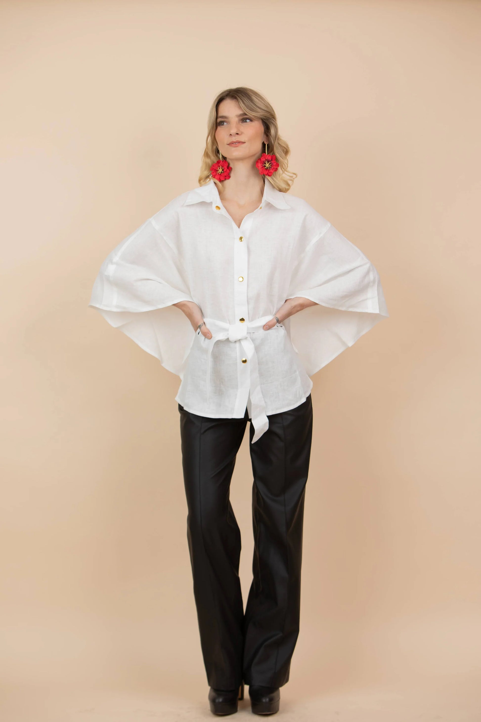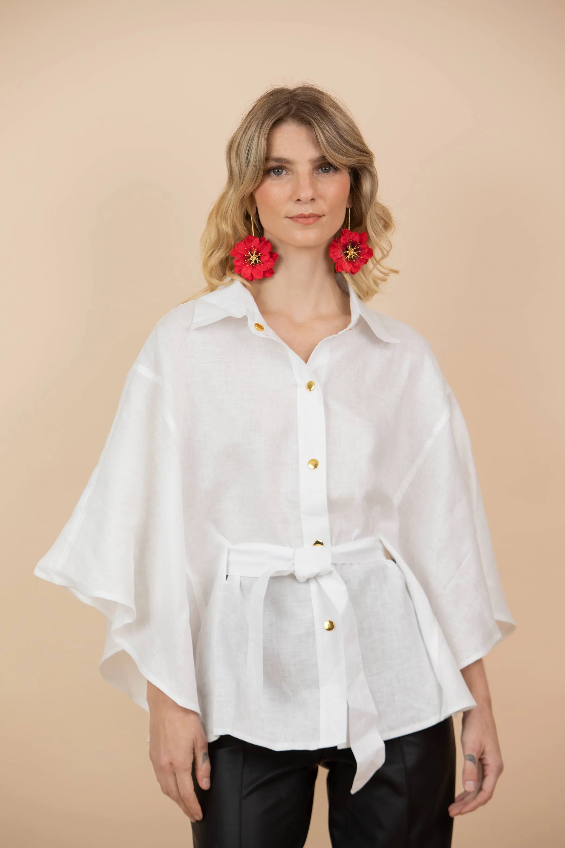 Capa con botones dorados y cinturón.