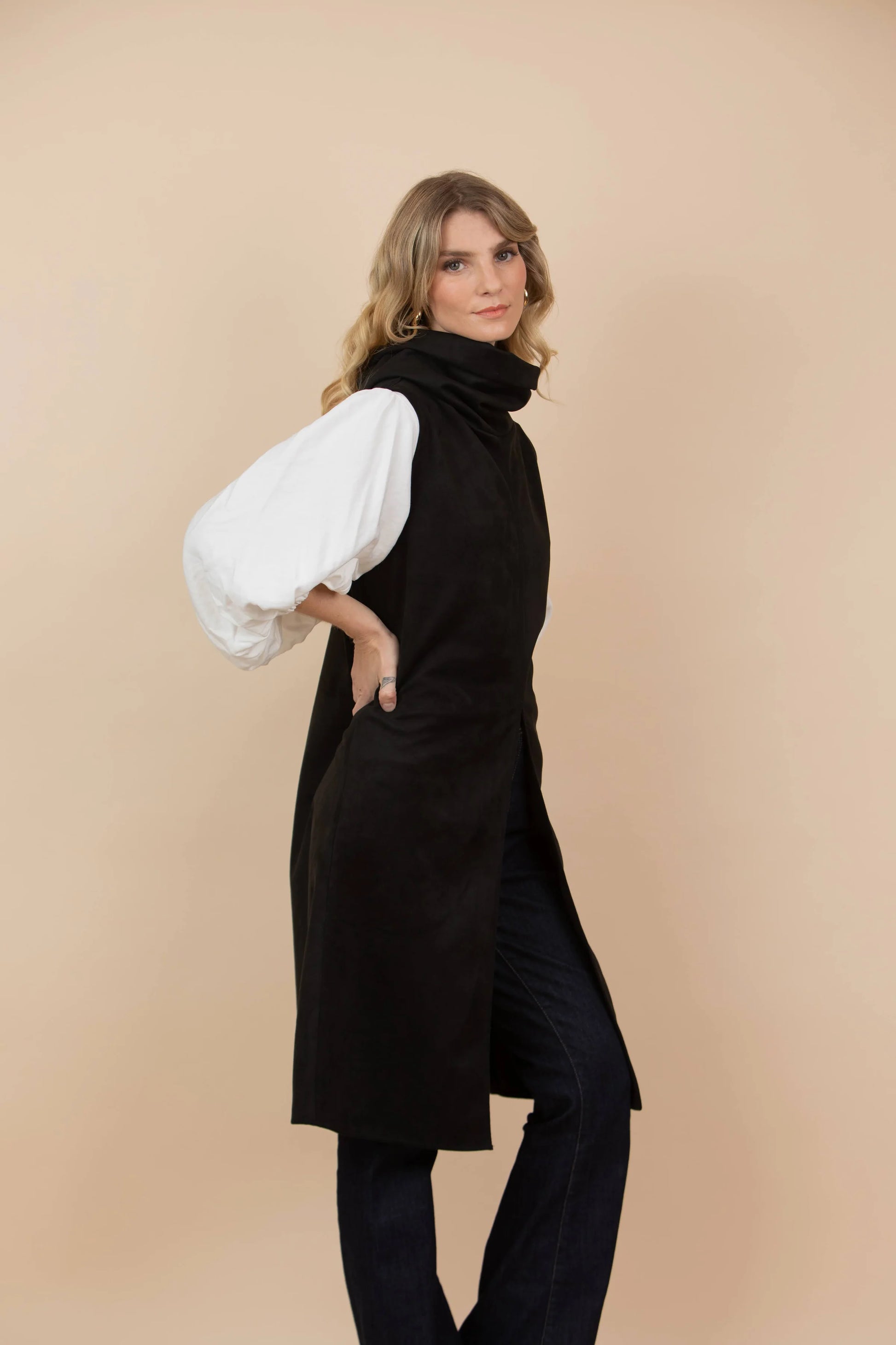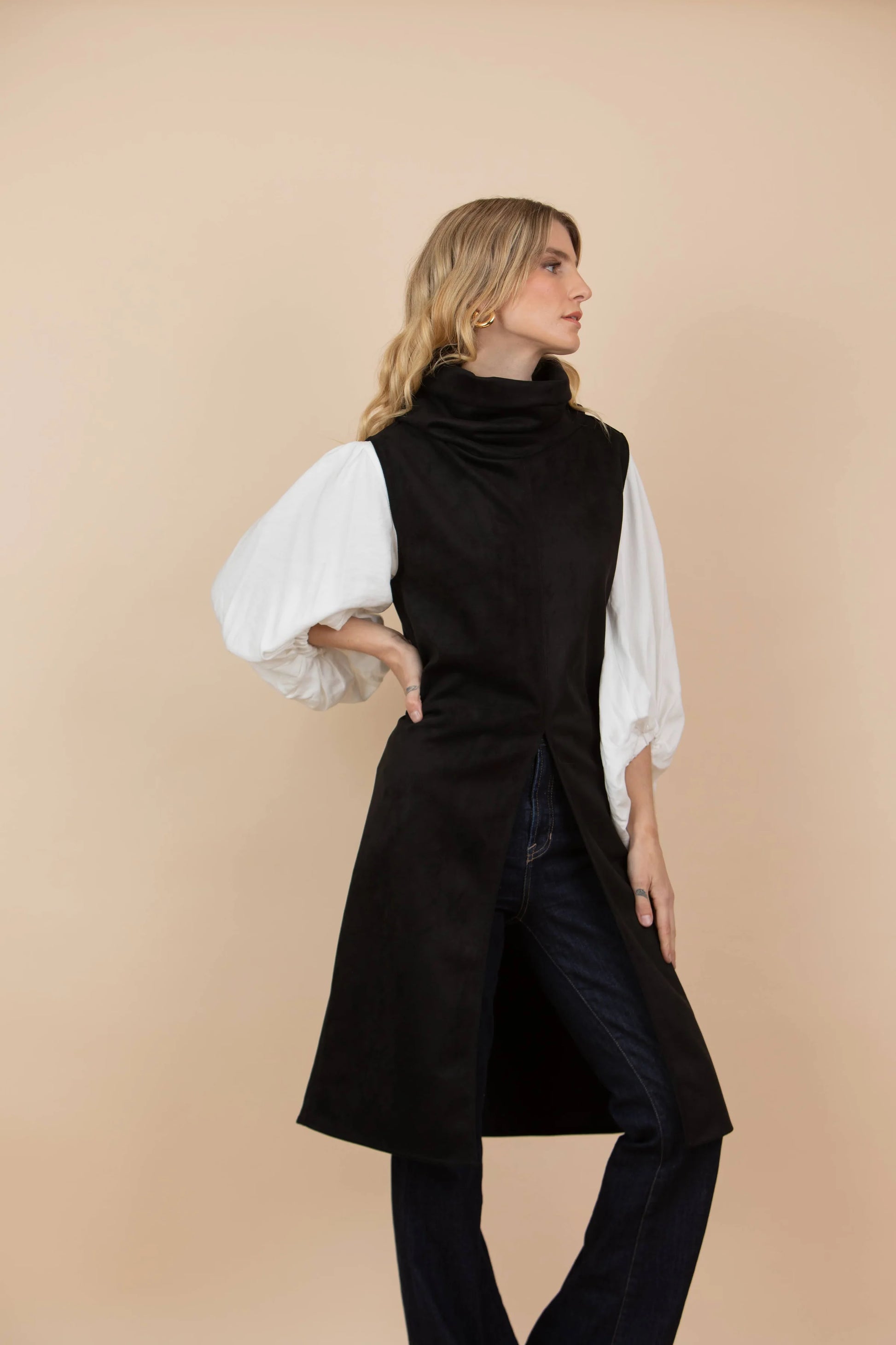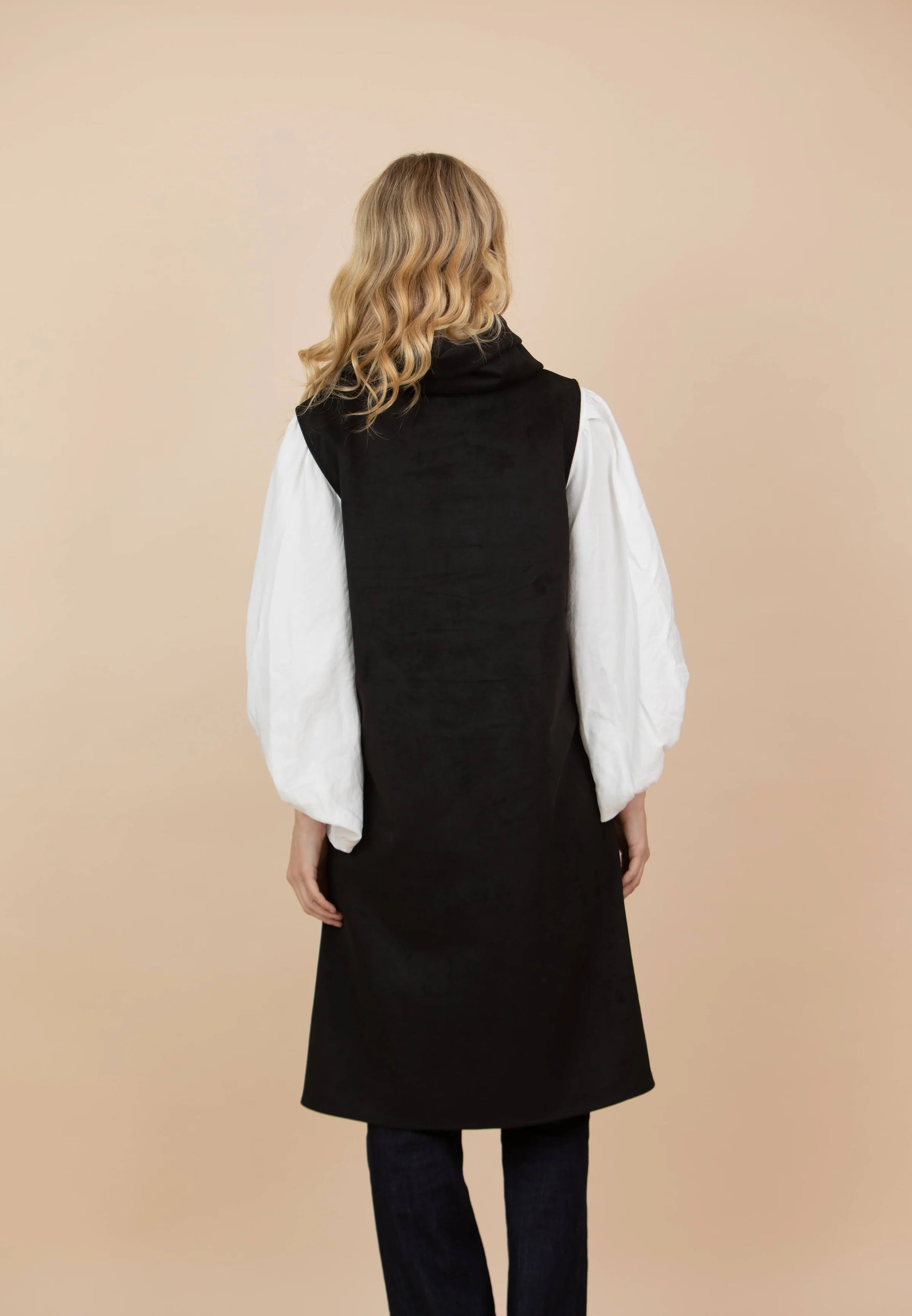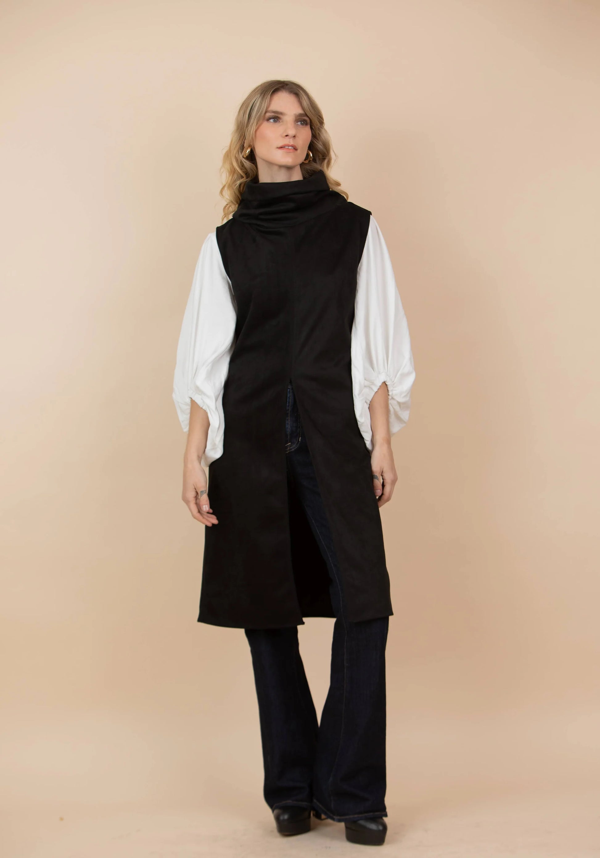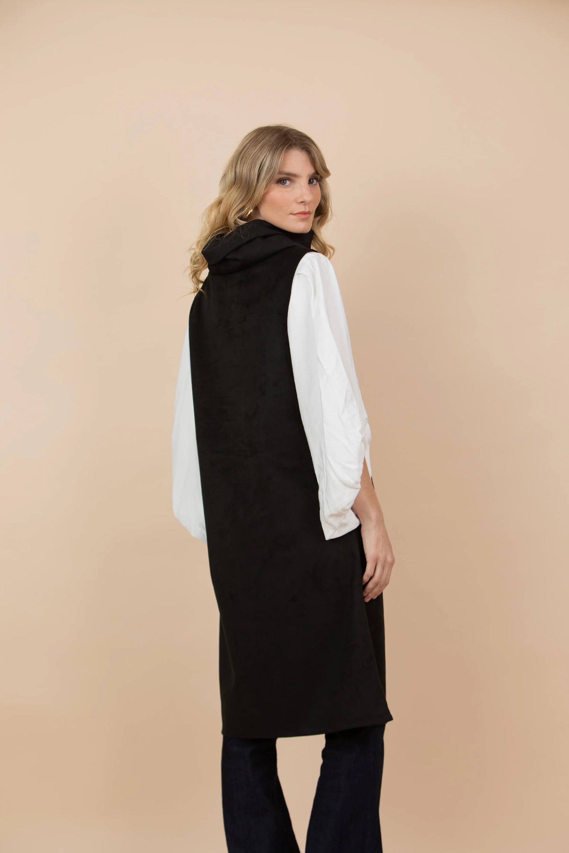 Chaleco largo en tela gamuzada con cuello tortuga de doblar.
